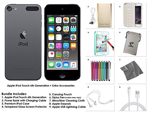 - Brand new iPod Touch with the Ultimate Accessory Bundle including Tempered Glass Screen Protector, Power Bank with Cable, TPU iPod Case, 1 Stylus Screen Pen (colors may vary), Microfiber cleaning cloth, Apple Earphones, Apple USB Cable, Convenient Carrying Pouch
